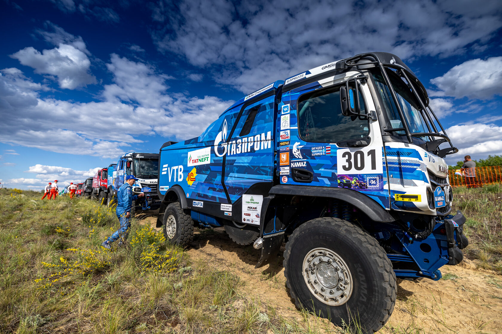 Эдуард Николаев, руководитель команды «КАМАЗ-мастер», пилот экипажа №304: «Отличный СУ, рабочий, интенсивный. Первую часть можно сравнить с мотокроссом, такие холмы, почти, как на мотоцикле проехали. Очень быстрый старт, тяжёлый грунт, не везде попадает машина в повороты, по сути идёт борьба с машиной: вовремя сбросить газ, вовремя нажать. Ехали интенсивно, видели, что подъезжаем к Сергею Вязовичу. Но за 8-10 километров до финиша услышали посторонний звук, начала пропадать мощность. Думаем, какие-то технические проблемы с турбокомпрессором или патрубком. Машина позволяла ехать, но в меньшем темпе. Ещё раз догнали Сергея. Несколько раз менялись позициями. Видно, что Сергей пропустил точку путевую и возвращался, финишировали вместе. Рад за наших ребят, что всё в порядке. После финиша сделаем анализ этапа».